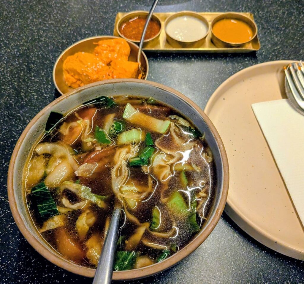 その店はヒマラヤ料理の店で、きっとラーメンっぽい麺があるだろうと入ってみたら、YES!!、メニューを見ると期待通りチベットなどで食べられるトゥクパというラーメン(うどんの方が近いか)があったので、早速注文した。醤油味で美味しいのだが、残念なことは麺がほんの少ししか入っておらず、スープのようであった。マネジャーに麺の量を倍にすれば、日本人や韓国人も喜んで食べるよとアドバイスした。